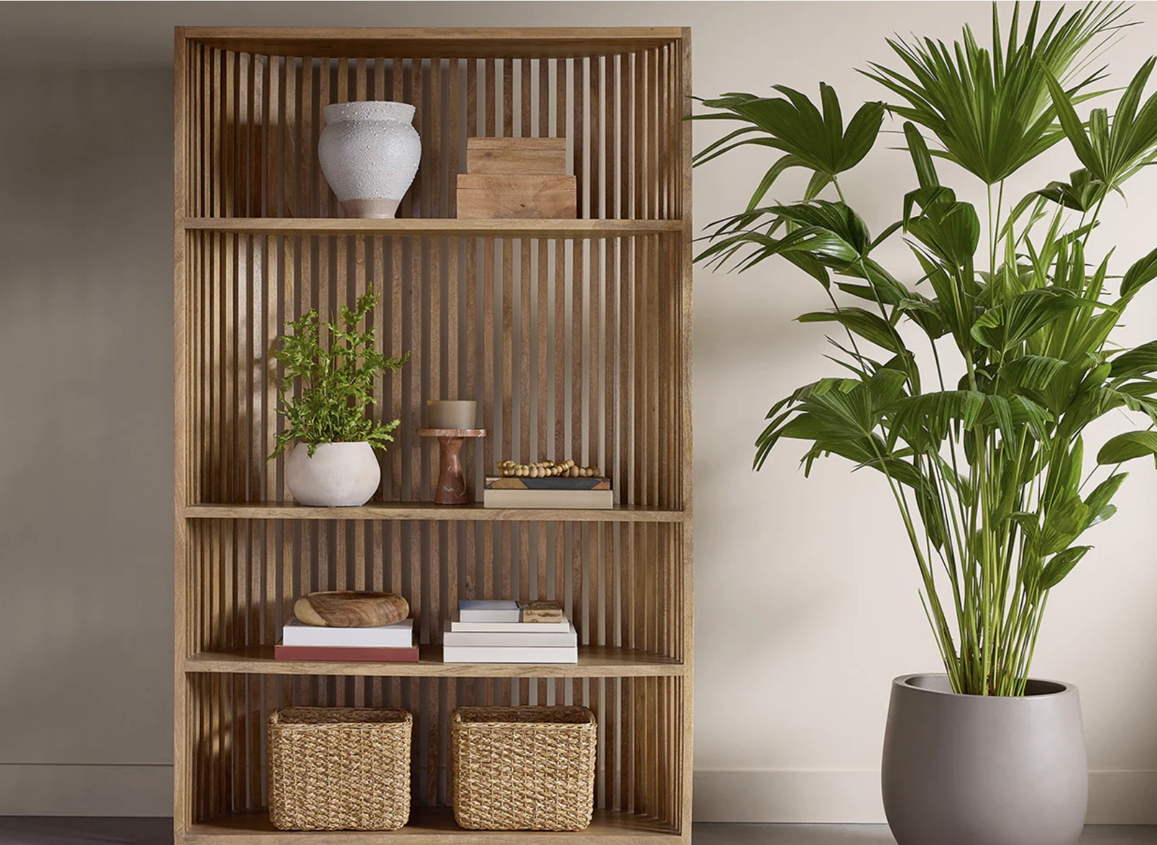 Inspired by global travels, this exotic bookcase is infused with modern appeal. Features a curved frame crafted from solid natural mango wood. Anti-tip kit included